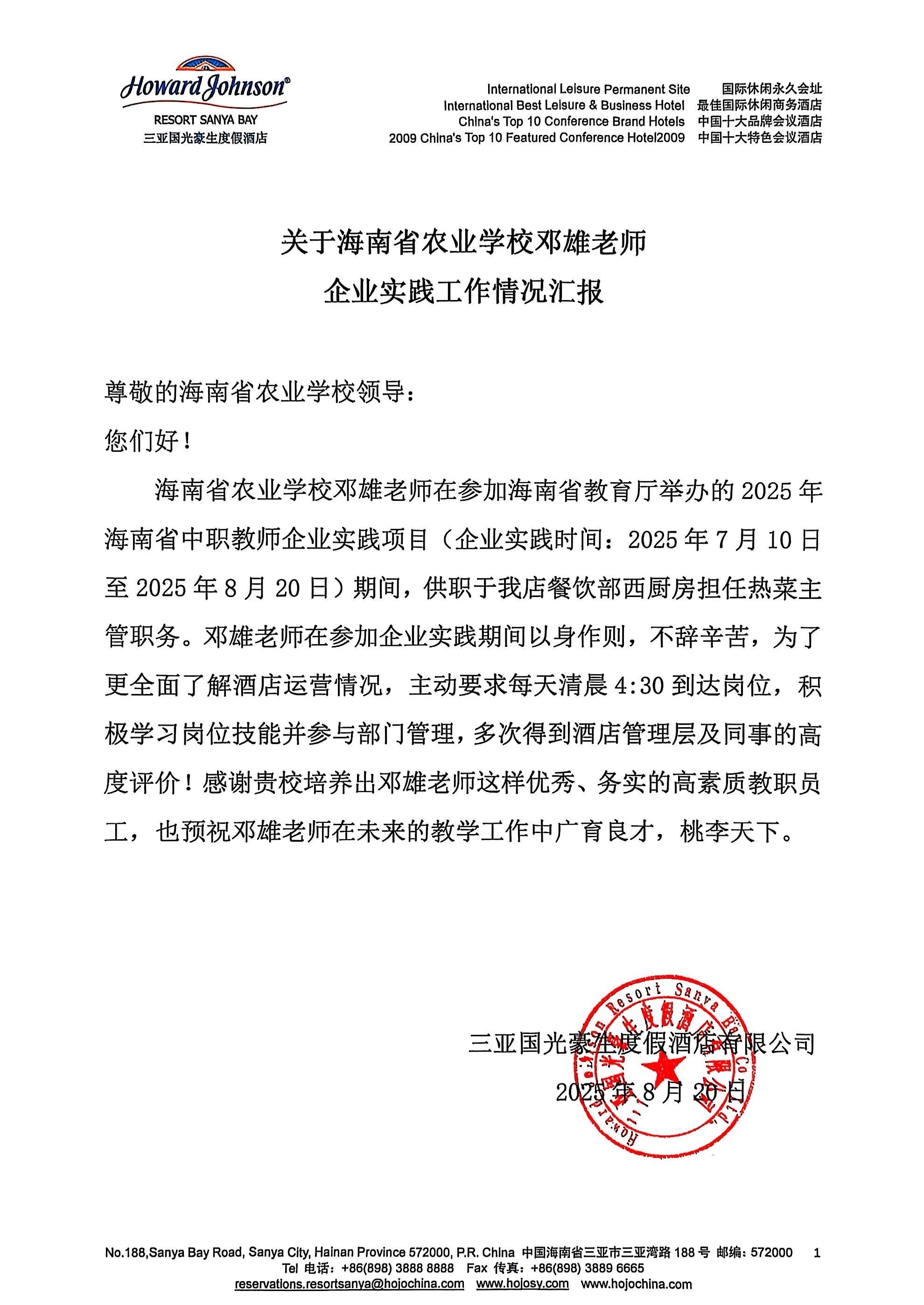 ??近日,我校邓雄老师顺利完成2025年海南省中等职业学校教师企业实践活动。在三亚国光豪生度假酒店有限公司餐饮部为期30天的实践锻炼中,他以饱满的工作热情和扎实的专业技能赢得了企业方的高度认可与书面表扬,充分展现了我校教师队伍的专业素养和精神风貌。