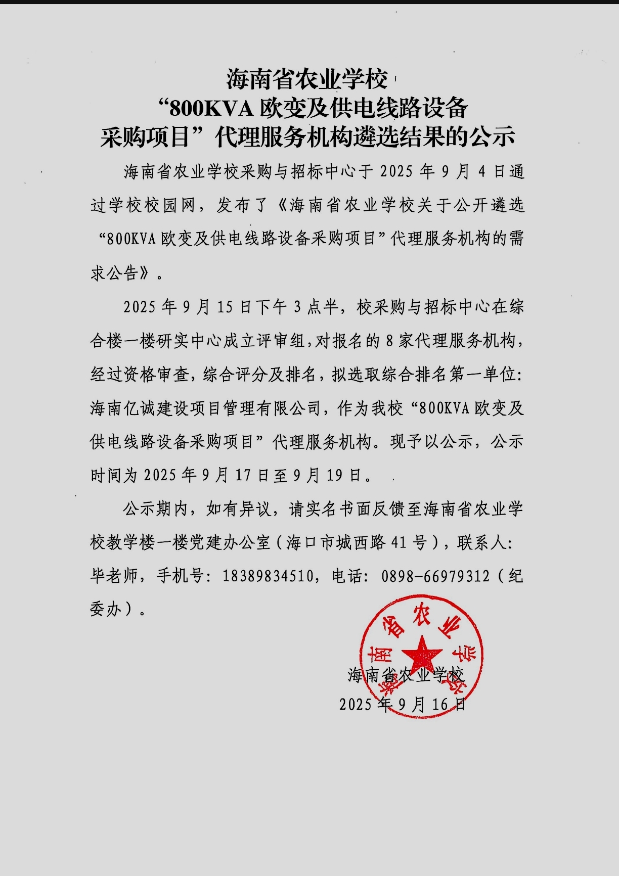 海南省农业学校“800KVA欧变及供电线路设备采购项目”代理服务机构遴选结果的公示