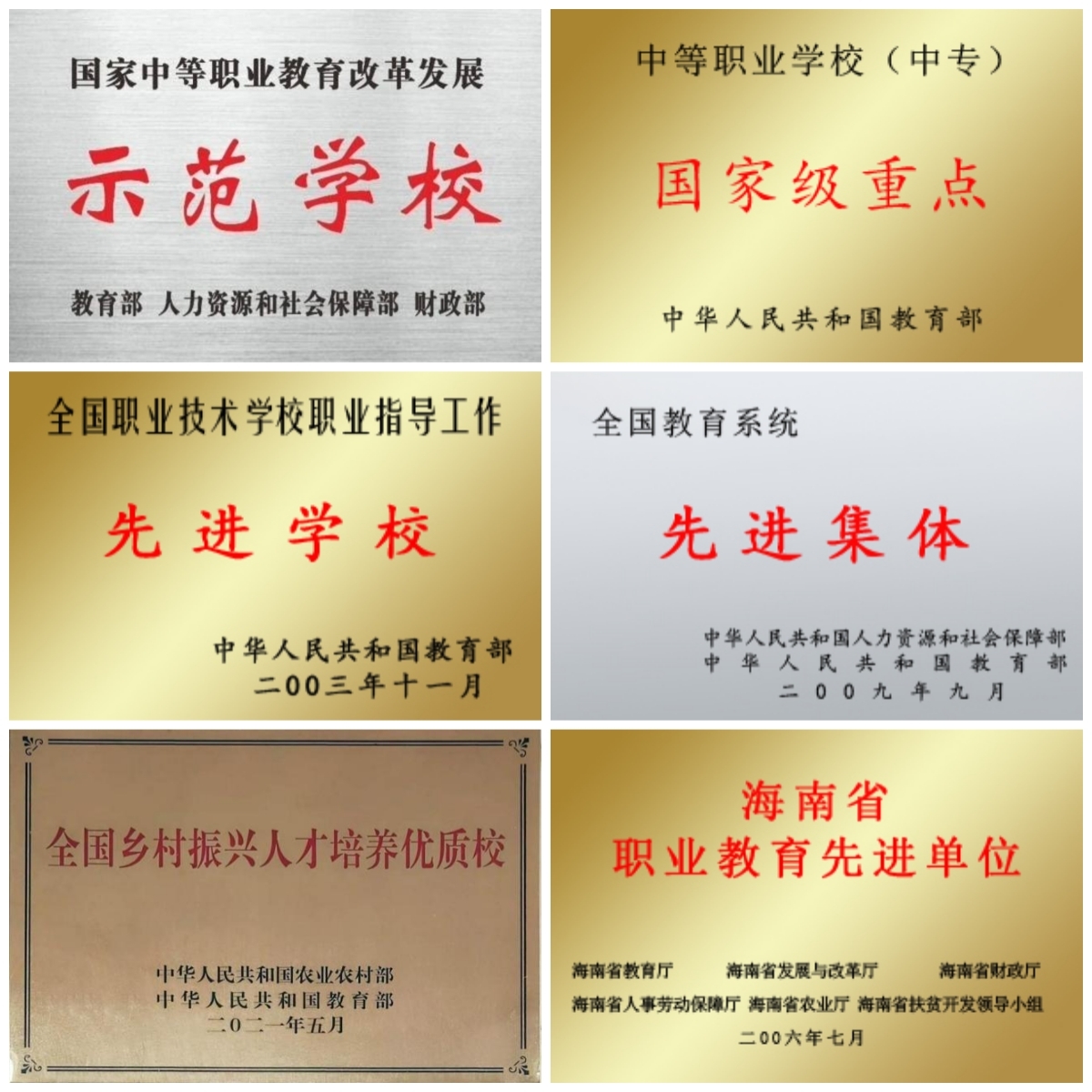 ??学校办学实力与社会声誉持续提升,相继获评国家级重点中职学校、国家中职教育改革发展示范学校、全国教育系统先进单位、全国国防教育特色学校、全国乡村振兴人才培养优质校、海南省中职“双优校”及省高技能人才培训基地等,先后获得“第三届海南自贸港技能大赛突出贡献奖”“绿化达标单位”“安全文明生态学校”“依法治校示范校”等称号。